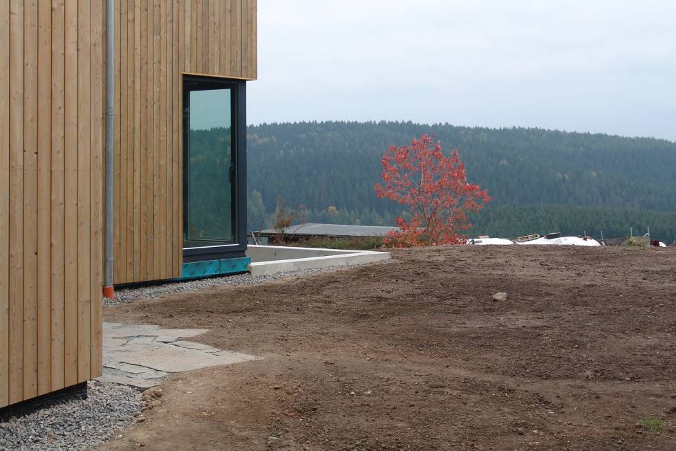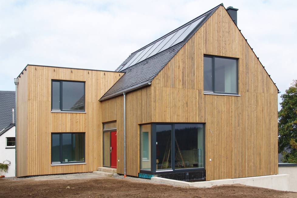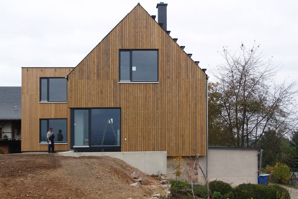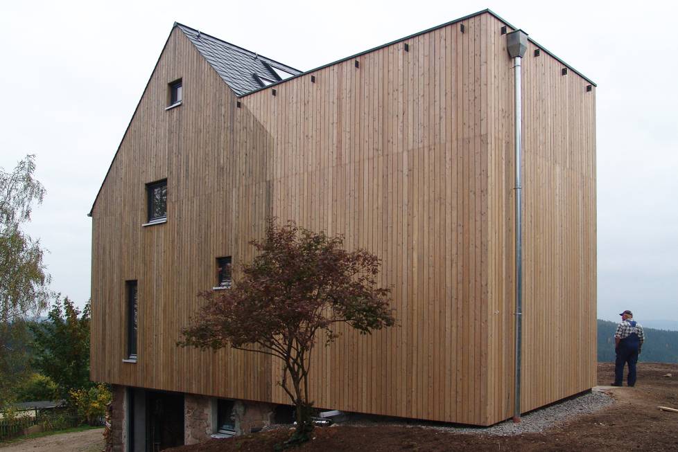 - Holzständer, Wärmedämmung und Lärchenschalung als Hülle